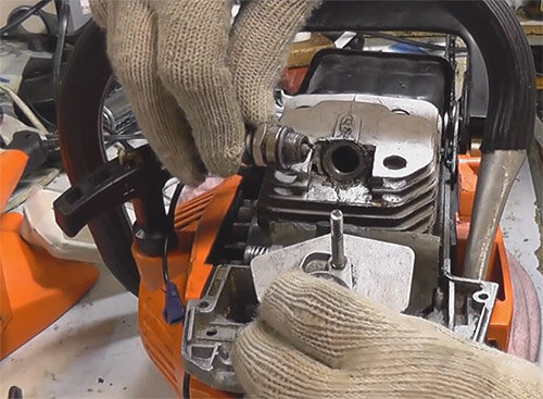 Ставим рычаг или переключатель в положение "заслонка закрыта". Если в модели предусмотрен топливоподкачивающийся насос - подкачайте топливную смесь в карбюратор. Оттените ручку стартера, пока не появится сопротивление, затем энергично дерните по амплитуде отводя руку в сторону (2-3 раза). Не нужно пытаться " вырвать" шнур из стартера бензопилы! Пила должна завестись, а потом заглохнуть. Если двигатель не завелся, переведите рычаг в положение полугаза или на рабочее положение, и попробуйте завести бензопилу в таком режиме. Обратите внимание, что большинство моделей имеют кнопочный выключатель зажигания. Убедитесь, что он включён. Случается, что когда запускают бензопилу в холодное время, случайно заливают камеру сгорания топливной смеси. В этом случае следует выкрутить свечу, просушить камеру сгорания холостым заводом, почистить свечу и завести пилу снова. Для проверки наличия искры на свече зажигания выкручивают свечу и соединяют с высоковольтным проводом, ложат на цилиндр и