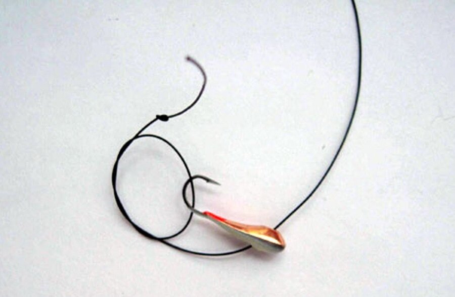 Всем привет! И вот осень подходить к концу, и на водоемах уже встает первый лед, в каких то регионах лед уже позволяет выйти на водоем и начать ловить рыбу. Эта статья будет полезна не только начинающим рыболовам, которые хотят попробовать так называемый вид рыбалки как подледный лов, но и так же поможет после длительного сезона открытой воды, освежить свои знания уже бывалым подледникам. Речь пойдет о самом простом, как правильно привязать мормышку для успешной ловли рыбы. Ведь если мормышку привязать не правильно, то количество поклевок уменьшится в разы из-за некорректной игры приманки. Вы уже наверняка знаете что мормышки делятся на два вида - безмотылки и мормышки с насадкой. Эти мормышки по-разному крепятся к леске. Большинство безмотылок имеют ушко для крепления их к леске, это значительно упрощает действие. 1. Берется конец лески и продевается ушко на мормышке. Конец лески нужно оставить по длиннее для удобства вязания узла. 2. Леска укладывается вдоль цевья крючка, конец возвр