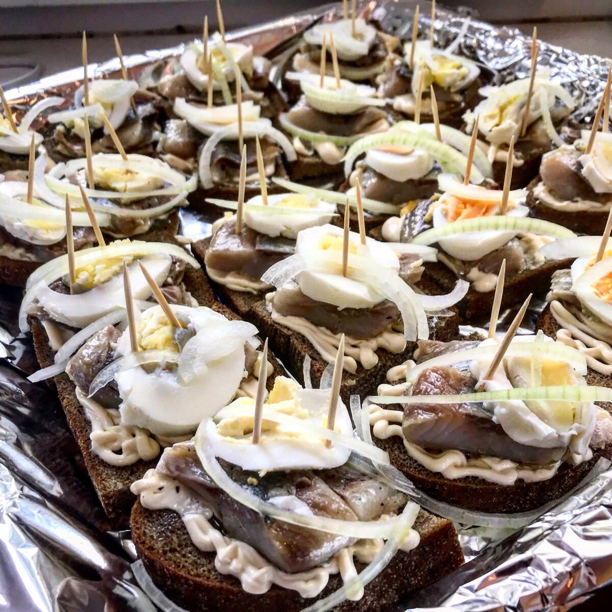 Режим хлеб на одинаковые кусочки, делаем сеточку майонеза, выкладываем 2 кусочка селёдки, дольку варёного яйца , сверху лук! Закрепляем нашу конструкцию зубочистками ! Готово !