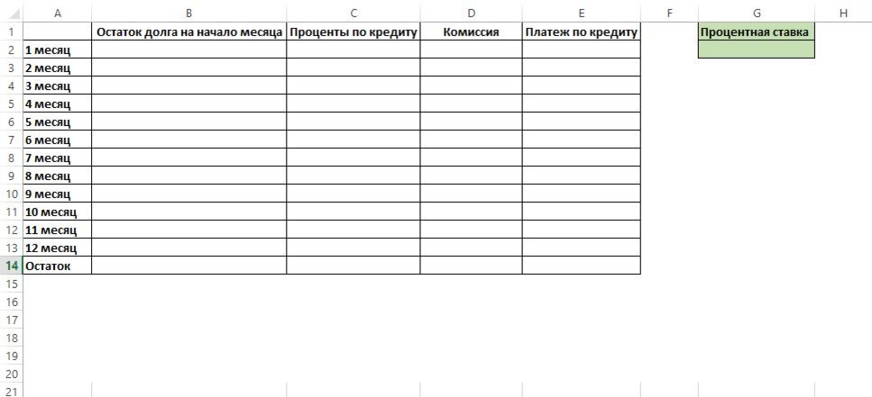 Делаем график платежей в Excel Если вы хотя бы немного умеете управляться с Excel, мои вам поздравления! Теперь вам не придется идти в банк, чтобы: - посчитать платежи по кредиту после досрочных погашений; - узнать переплату по кредиту; - определить, в какой срок вы закроете «кредитку», если будете платить по 5/7/10 тысяч в месяц; - посмотреть, выгодно ли рефинансировать кредит; - выяснить, сколько вы сэкономите, если погасите долг «прямо сейчас» и т.д. Небольшая табличка в Экселе, пара несложных формуд – и вуаля, вы великолепны! Готов примерный график погашения по любому кредиту или карте. Приступим? Шаг первый. Делаем таблицу. Открываем Excel. «Обзываем» несколько столбцов: - Остаток долга на начало месяца: - Проценты за месяц; - Комиссии (если есть, конечно, и при этом они включаются в платеж. Разовые комиссии сюда не пишем – они только помешают расчетам): - Платеж по кредиту. Отмеряем вниз столько ячеек, сколько будет платежей (например, 12, как у меня в образце). Отдельну