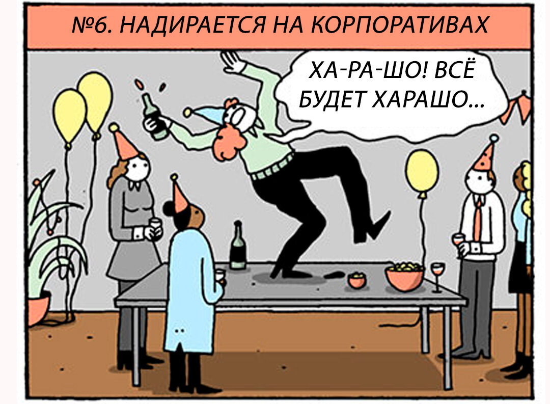 Вы в курсе, что при продолжительности жизни в 70 лет спим мы где-то 25 лет, а на втором месте по «времяпотере» у нас будет работа? Там мы проводим в среднем 10 лет! С ума сойти можно: 10, блин, лет мы окружены разными людьми, умными и не очень, приятными и не очень, нормальными и откровенно мутными. С ними связано столько историй, воспоминаний и наблюдений, что можно еще годика три потратить, рассказывая всё. Здорово, что на выручку пришла талантливая художница Элизабет Пич и, очевидно, в целях экономии времени каталогизировала коллег. Она разделила их на 10 типажей. По мнению девушки, каждый из нас на работе хотя бы раз встречался с каждым типом (а, скорее всего, работает рядом с таким прямо сейчас). Кстати, Элизабет Пич – художница известная. Она – половинка классного творческого дуэта War & Peas («Война и горох»), чьи комиксы сейчас очень популярны и нравятся любителям небанального, чуть мрачноватого юмора. Элизабет – наполовину немка, наполовину американка, окончила художку, полу