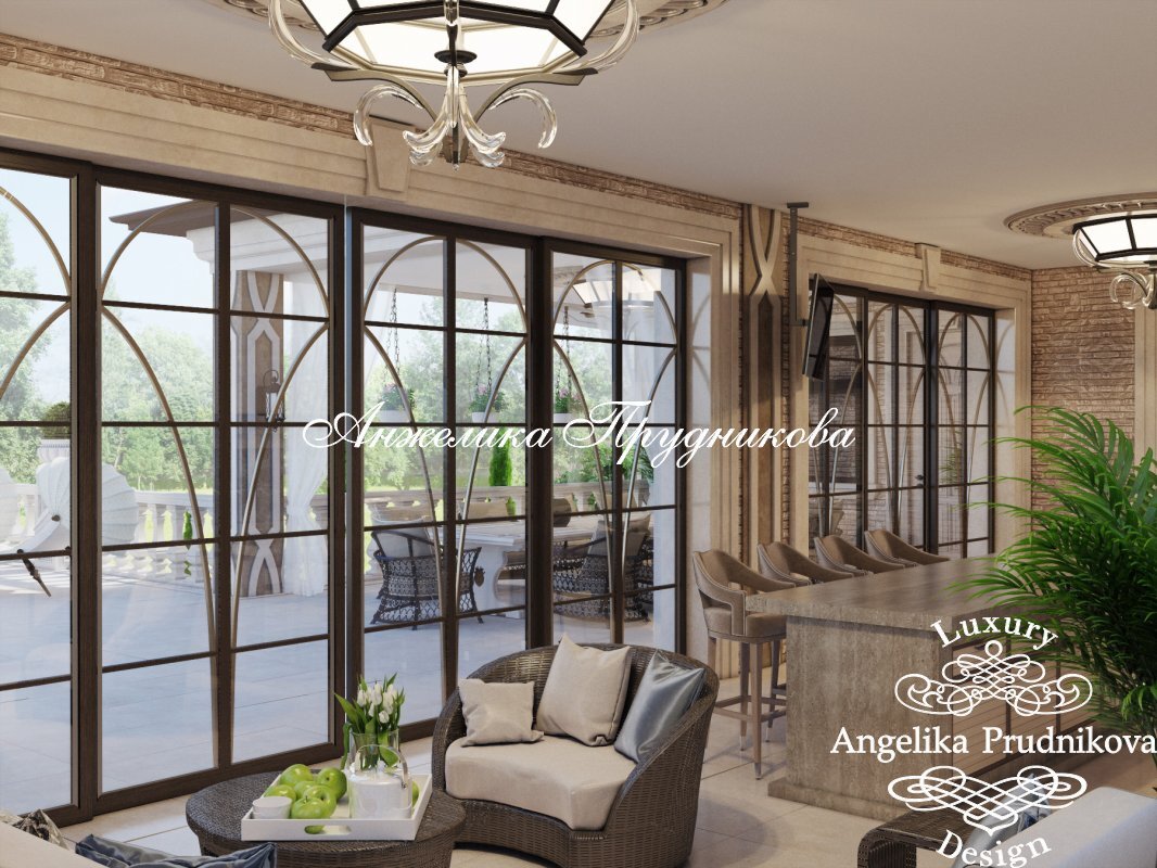 Центр террасы занимает обеденный стол, окружённый удобными креслами. В веранде главными являются зона барбекю и широкая барная стойка с четырьмя стульями. По углам и вдоль стен расставлены диваны и кресла для отдыха. Уличную и закрытую части террасы объединяют одинаково обрамленные фасадные окна, круглые потолочные розетки, выложенный плиткой пол. Светлые древесные оттенки мебели и отделочных материалов не отвлекают от буйства природной зелени за пределами помещений. Всё стремится к гармонии и умиротворению. Полная фотогалерея проекта: https://angelika-prudnikova.design/dizajn-portfolio/dizayn-terrasy-i-verandy/dizayn-proekt-interera-terrasy