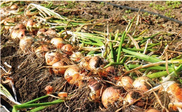 После извлечения луковиц из земли хорошо день просушить его на солнце рассыпав в один слой. Затем для просушки лук переносят под навес или в сухое проветриваемое помещение для дальнейшей сушки. Луковицы желательно рассыпать на сетке в один слой, чтобы они продувались.