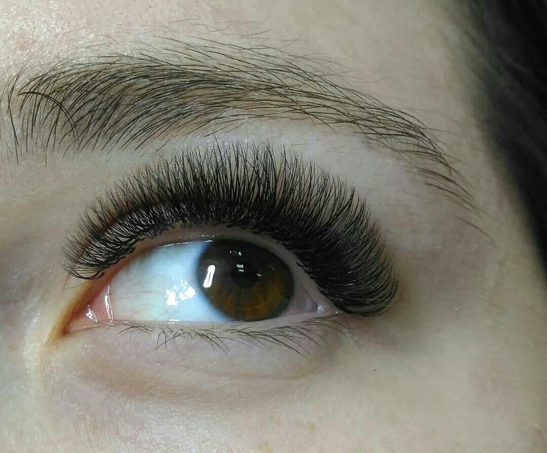 Далее я начала интересоваться, как обстоят дела в нашем городе с ресничными мастерами: искать студии по наращиванию ресниц, смотреть какие работы там, цены, кто основатель, обучает он или нет, какая обстановка с частными мастерами. Через два месяца, немного владея информацией, я выбрала курс по объемному наращиванию ресниц, также за среднюю сумму, 2 дня обучения, но уже видела работы преподавателя в соцсети. Она же являлась и является представителем в нашем городе одного из брендов материалов по наращиванию ресниц и их школы. Первый день был - теория, второй - практика. Проверяла работу она по всем правилам: отступ, склейки, направление. К счастью, на обучении мне попалась модель с редкими ресничками и я быстрее всех управилась с объемом 2-3д толщиной 0.07 за 4.5 часа. Моя первая работа на обучении ниже.