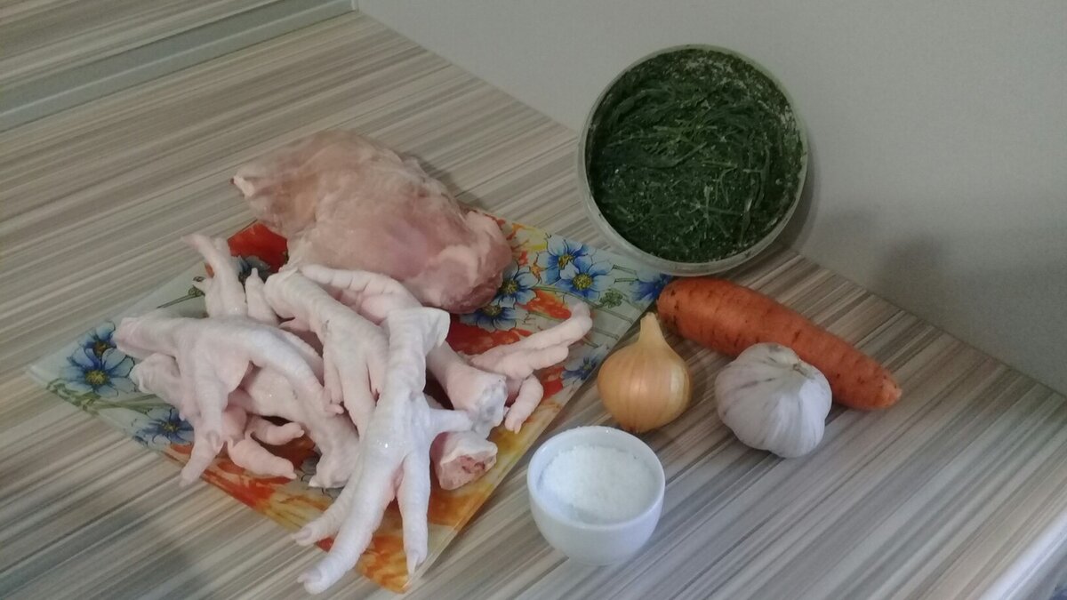Ингредиенты: Куриные лапки 1 кг. Часть курицы (например: грудка, нога и т. д.). Лук репчатый 1 шт. Морковь 1-2 шт. Соль, зелень, чеснок по вкусу. ПОШАГОВЫЙ ФОТО РЕЦЕПТ. 1. В кипящую воду опустить куриные лапки (ноготки можно отрезать), часть курицы, лук целиком (очищенный), морковь целиком (очищенную), варить 3 часа на маленьком огне при закрытой крышке. Вытащить шумовкой содержимое кастрюли, бульон процедить. Куриные лапки и лук выбросить, а мясо нарезать или пощипать. 2. Добавить в бульон соль, чеснок выдавить через чесночницу, зелень. 3. В посуду положить для украшения морковь, мясо. 4. Залить бульоном. Остынет на столе, убрать в холодильник. 5. Перевернуть форму и вылощить на блюдо готовый холодец. Приятного аппетита.