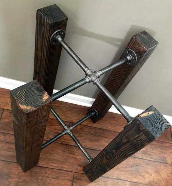 Многие хотят сделать уют и красоту в своем гараже, для многих это второй дом, в котором проходит большинство времени дня и ночи. Главный элемент конечно же это стол, не верстак, а именно стол, конечно же покупать новый стол не разумно, поэтому мы рассмотрим вариант как сделать из доступных материалов нижнюю часть стола. В настоящее время дерево очень ценится, поэтому мы выполним из него ножки для нашего будущего стола. Просто использовать деревянные бруски не будем, казалось бы банально и не совсем надежно, для жесткости конструкции будем использовать следующие элементы: 1. Брусок 90 х 90 миллиметров в количестве 4 штук. 2. Разветвитель труб четырехконтурный, 2 штуки. 3. 8 трубок по 25 сантиметров такого же диаметра как и разветвитель. 4. Крепления трубки и бруса плоский под 4 самореза 8 штук. 5. Чтоб придать брусу и металлу красивый внешний вид, используем краску по металлу и по дереву. Приступаем к сборке. Подготавливаем бруски для покраски, зачищаем все неровности и шлифуем кажд