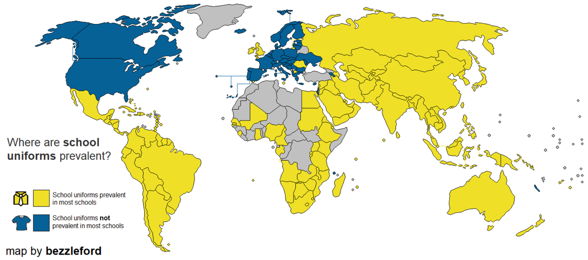 Вот уже десятки лет ведутся активные дебаты относительно школьной формы. Нужна ли она, какой должна быть, подавляет ли она учеников или же дисциплинирует? С одной стороны, форма делает детей равными и прививает чувство принадлежности к школе. С другой стороны, пошив специальной униформы ударяет по карману родителей, которые и так тратятся на учебники, канцелярию и репетиторов. Взглянем на карту, где страны мира поделились на две группы: те, в которых школьная форма является обязательным условием посещения занятий и те, где школьная форма не несет за собой никакой значимости. Исключением стали страны, окрашенные в серый цвет, где исследование не проводилось. Облаченные в желтый цвет страны голосуют «за» школьную форму. В нашей стране впервые форма появляется во времена Николая I. Тогда одежда не несла в себе целью сделать учеников равными. Напротив, форма была отличительным знаком для детей, принадлежащих к высоким сословиям. За всю историю существования, форму то отменяли, как пережи