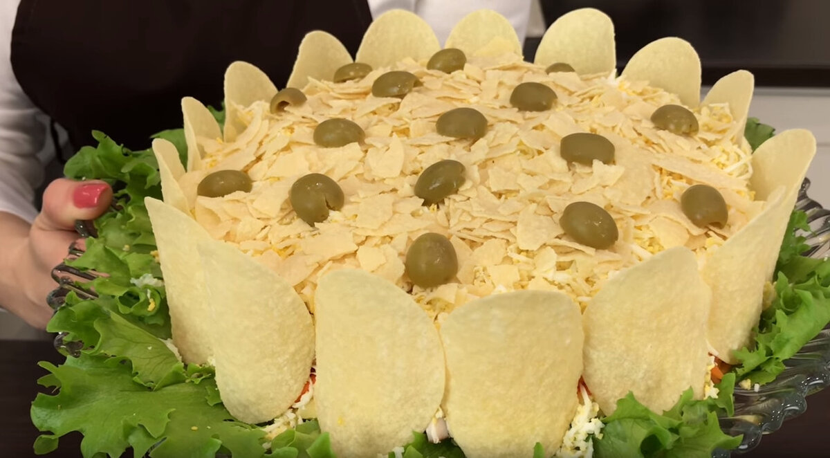 Всем привет. Это канал "Самые вкусные рецепты". Сегодня будем готовить необычный салат с морковкой по-корейски и копченной курицей. Очень классная идея. Нам понадобится: Картофель 4 шт. Копчённая курица 200 г. Морковь по-корейски 200 г. Яйца 3 шт. Чипсы 100 г. Сметана 70 г. Майонез 70 г. Соль, перец Маслины , листья салата Сметану и майонез смешиваем, добавляем немного соли, перчика. (Можно добавить сухую петрушку или укроп). Начнем с картошки. Натираем картофель на крупной терке сразу на салат. Не забываем подсолить и поперчить. Сверху все заправляем соусом и распределяем по поверхности. За тем морковку по корейски выкладываем на соус. Все аккуратно распределили. В этом салате морковь дает сочность, немножко похрустывает. Создаёт пикантный вкус салату. Куриную грудинку режем вдоль полосочками. Сверху выкладываем мясо. И затягиваем соусом. За тем сверху заправки натираем на мелкой терке яйца. Теперь берем оливки или маслины, перерезаем их пополам, подготавливаем их для декора. Чипс