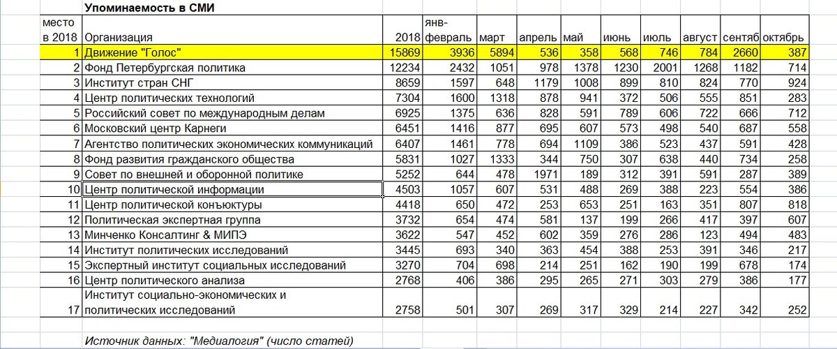 Движение «Голос» за январь — октябрь 2018 г. упоминалось в российских СМИ почти 16 тысяч раз, т.е. в среднем 52 раза в день (включая праздники и выходные дни). Это гораздо больше, чем у любого из центров политического анализа и консалтинга, которые получают деньги за работу на кандидатов. И это крайне важно, потому что только так мы можем донести до наших сограждан правду о выборах. Такая эффективность стала возможна лишь благодаря вашей поддержке, в том числе и материальной. Сделайте свой «Голос» еще сильнее — подпишитесь на ежемесячную поддержку http://amp.gs/vO3h