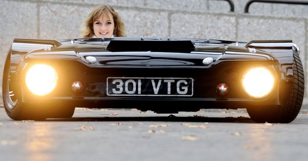 Продолжаем собирать различные «самые» транспортные средства, созданные руками человека. В прошлый раз мы рассказывали о самом маленьком автомобиле, а сейчас покажем самый низкий из существующих. Называется машина Flatmobile. Ее создатель британец Перри Уоткинс (Perry Watkins) – конструктор занимающийся созданием уникальных машин на протяжении многих десятилетий. Нередко его творения попадают в Книги рекордов Гиннесса. Flatmobile также удостоился места в этой книге как самый «плоский» автомобиль – его высота всего 48.3 см. По признанию самого Перри, дизайн машины придуман под впечатлением бэтмобиля – транспортного средства, на котором передвигается герой комиксов Бэтмен. Сзади можно заметить трубу от реактивного двигателя. На самом деле это муляж и в машине установлен обычный двигатель внутреннего сгорания. Но труба не просто внешне повторяет реактивную турбину, она еще может имитировать огненный хвост. Этот девайс был собран на основе турбокомпрессора Holset 685 от грузовика Volvo. Нес