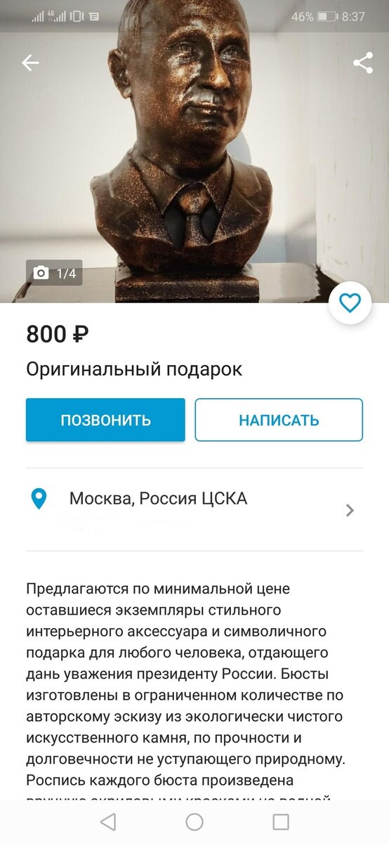 На сайтах объявлений чего только не продают. Некоторые вещи действительно пригодятся в доме, другие – займут особое место в кладовых коллекционеров, а третьи просто вызывают недоумение. Смотрите сами. На первое место возведу бюст Ленина, точнее Путина Почему-то казалось, что вся эта история с гипсовыми и бронзовыми бюстами ушла в прошлое, но нет. Есть еще умельцы, изображающие лики известных людей в образе скульптур. Между прочим, по хорошим ценам. Такая вещица, думаю, пригодится для какого-нибудь музея современной истории России или большого патриота страны. Брендовые пакеты Может, для кого-то это будет удивительно, но некоторые девушки готовы приобретать фирменные пакеты, чтобы потом красоваться с ними на фото в Инстаграме. Необязательно закупаться в дорогущем бутике «Шанель» для создания необходимого антуража – покупайте пакеты по дешевке в объявлениях и носите в них что угодно. Кому не хватает кальция Многим известно, что некоторые беременные, испытывающие острый недостаток кальц