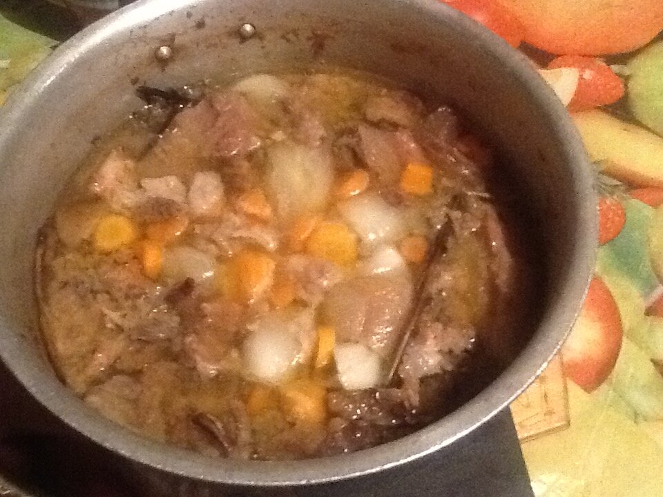 У меня были остовы от кур и обрезки говядины, добавила немного свиной шкурки, она заменит желатин.