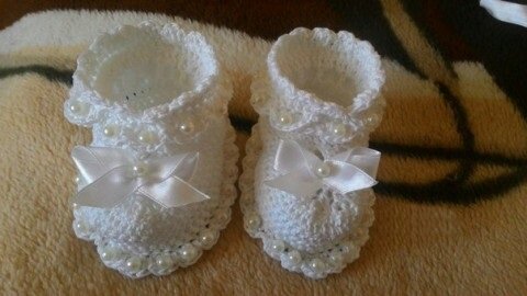 Пинетки для девочки ( белые). Пряжа – детский хлопок Kid’s Cotton. Крючок №2. Для украшения использовала бусинки и атласную ленту. Получились нежные пинетки на девочку, возраст до 6 месяцев. Вязание пинеток начинаем с подошвы. Наберите на крючок 15 в.п. В последнюю 15-петлю (первую от крючка) провяжите 6 ст с/н. В 13 последующих воздушных петель провяжите 13 ст.с/н. В крайнюю 15-ю петлю провяжите 6 ст.с/н. Провяжите 13 ст.с/н и вернитесь к месту начала вязания. Провяжите 1 сбн, чтобы соединить и закончить ряд. Наберите 1 в.п. в качестве петли подъема. В ту же петлю, с которой вывязывали сбн, провяжите 1 ст.с/н. Дальше согласно схеме вязания подошвы провязываем по 2 ст.с/н в каждый ст.с/н предыдущего ряда. Итого, нужно провязать 12 ст.с/н. Продолжаем вывязывать овал. Провязываем 13 ст.с/н на центральной части подошвы. На круговой части провязываем 12 ст.с/н. Потом снова на средней части – 13 ст.с/н и заканчиваем ряд так же как и первый круговой ряд столбиком без накида. Аналогично пер