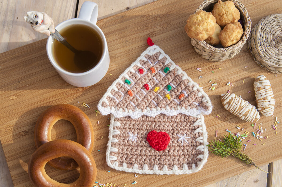 Свяжите сердечко по схеме выше. Вышейте украшения (снежинки, полосочки) на домике, пришейте разноцветные помпоны, бусины и тд