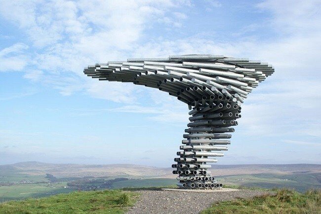 Расположенный в Ланкашире, Англия, 3-метровое Поющее дерево в Бернли-это чудесная скульптура, построенная из оцинкованных стальных труб различной длины с отверстиями, проколотыми на их внутренней стороне. Подобно тому, как музыкант играет на флейте, ветер заставляет петь это дерево.