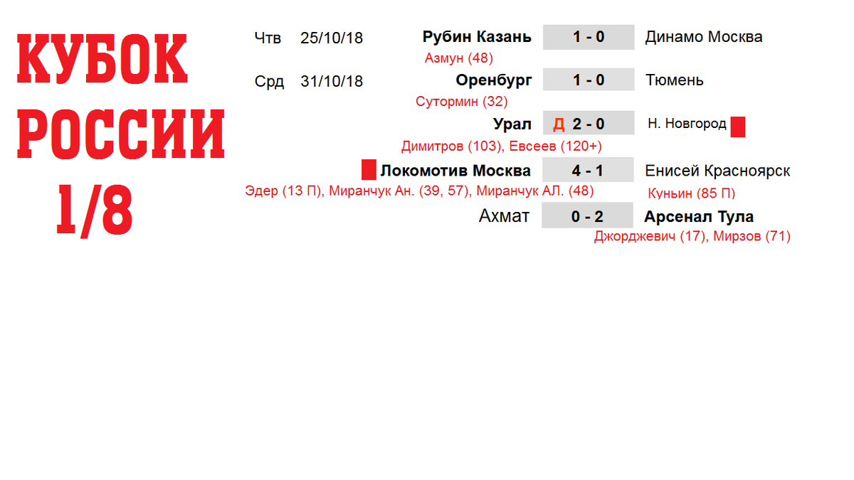 здравствуйте любители российского футбола, состоялись все матчи кубка 1/8, также в этом видео мы узнаем, и про сетку турнира, и дальнейший путь команд. Рубин и Динамо сыграли самыми первыми свой матч ещё 25 октября. 1-0 победил казанский клуб, за счет гола Азмуна. И на момент записи этого видео Рубин не проигрывает уже 11 игр. 6 из них он свел в ничью. Динамо и Рубин до этого в очных матчах трижды играли между собой в ничью. В следующий раунд прошел Рубин. Оренбург побеждает 1-0 Тюмень и также выходит в следующий раунд. Эта игра прошла 31 октября. Тюмень представляет ФНЛ. И уже 5 игр не может выиграть к ряду. Именно этот клуб из 1/16 выбил ЦСКА, за Оренбург отметился СутормИн с пенальти. Последний его гол был 2,5 месяца назад в воротах Анжи. Оренбург 4 игры идет без поражений. Урал в дополнительное время вырывает победу у Нижнего Новгорода 2-0. Основное время завершилось 0-0. Забивали Димитров, и вышедший на замену в экстра тайме Евсеев. Нижний Новгород получил ещё и удаление в матче