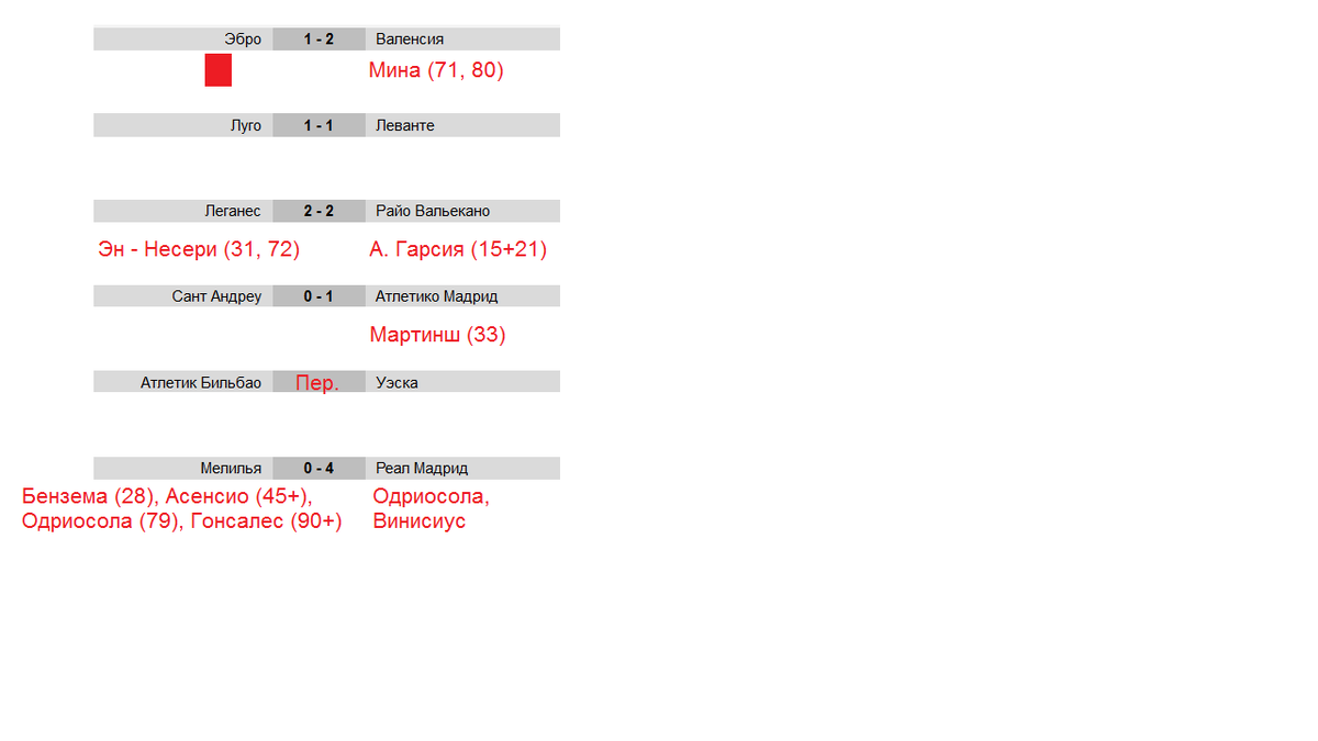 в кубке Испании состоялись игры 1/16 финала, вот их результаты, аутсайдер 3й по силе испанской лиги Сегунды Б Эбро уступает Валенсии 1-2. Команда хозяев большую часть игры была в меньшинстве. у Валенсии 2 мяча записал Санти Мина. Это его первая игра после месячного отсутствия. Ну и поздравим Валенсию, после 5 ничьих в подряд они выиграли наконец-то. 7я команда Примеры Леванте не смогла обыграть Луго 1-1. Луго играет на один дивизион ниже в Сегунде. В позапрошлом сезоне Леванте и Луго играли в одной лиге, и тогда выиграли по разу. У Леванте 5 матчевая беспроигрышная серия. Леганес Райо Вальекано это клубы высшего дивизиона, и они сыграли в ничью, и оставили выяснения сильнейшего на вторую игру, да на этой стадии, противостояния состоят из 2 матчей. Эн – Несери сделал дубль за Леганес. У Райо выделим Альваро Гарсию, у него в матче гол + пас (15 + 21). В чемпионате 3,5 недели назад выиграл Леганес 1-0. Сант Андреу Атлетико. Мадридцам все равно у кого выигрывать, лишь бы со счетом 1-0.