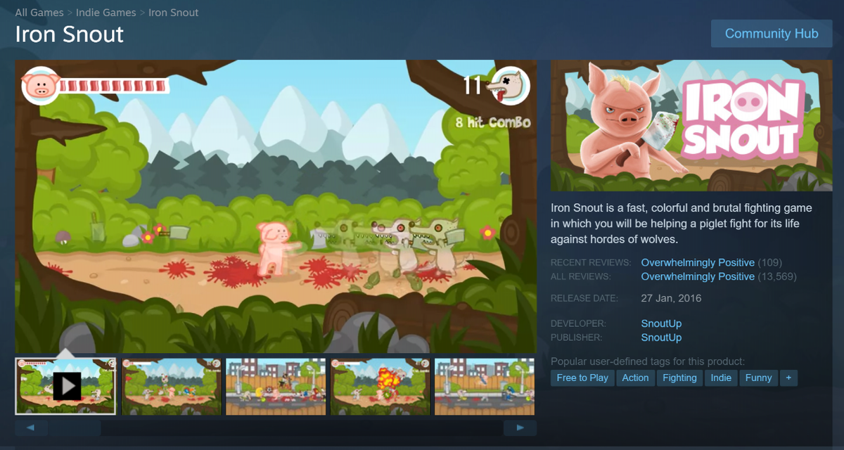 Сегодня будет обзор на игру "Iron Snout", в переводе с английского "Свиное Рыло", которую можно найти в сервисе Steam. Игра представляет из себя платформенный файтинг. Играть предстоит за свинью, сражающуюся за жизнь с ордами волков. Свинка, к слову, обладает исключительными навыками Кунг Фу. Сальто с ударом ногой? - Легко! Отобрать у одного врага оружие и швырнуть в другого? - Запросто! Игра доступна только на английском языке, но в этом нет ничего страшного, так как читать в ней ничего не придётся. Разберем главное меню. Справа видим статистику игроков, слева пункты меню. Чтобы начать играть нажмите START GAME, ниже идет выбор типа персонажа, статистика, настройки и выход из игры. Перед началом игры советую зайти в настройки. Первый пункт переключает режим запуска: в окне или во весь экран. Далее идёт вертикальная синхронизация, настройки геймпада, громкость музыки, громкость звуков, отображение крови (если в игру будет играть ребёнок, рекомендую переключить этот параметр н