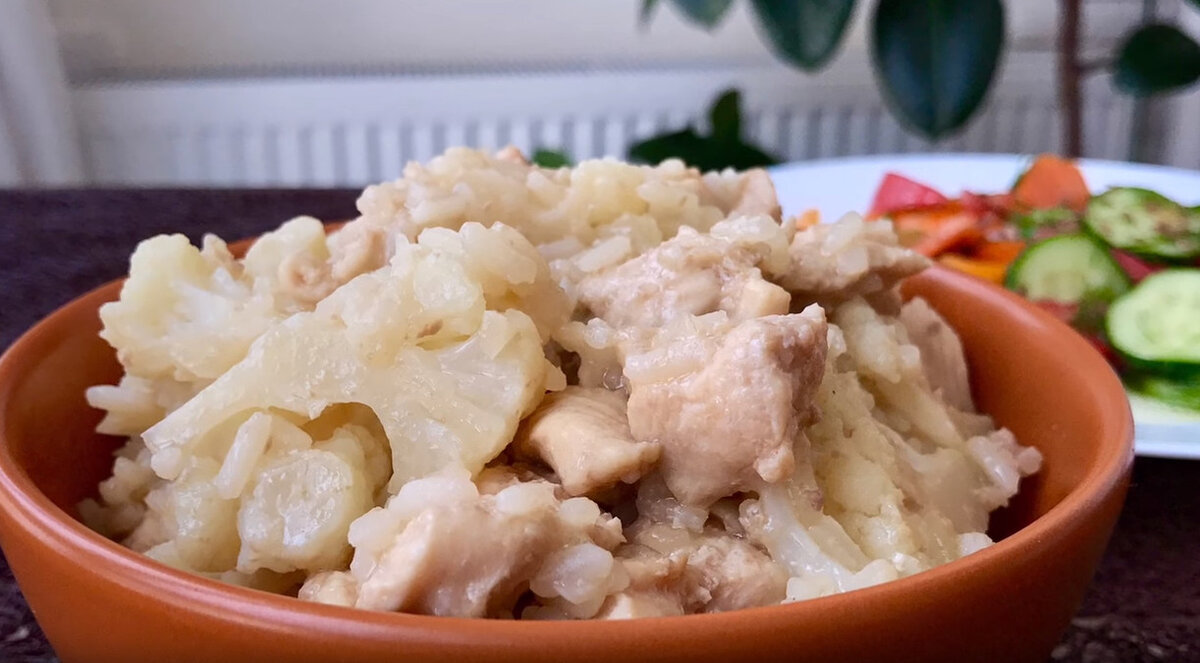 Всем привет. Это канал "Самые вкусные рецепты". Если у вас мало времени, а вы хотите приготовить очень вкусно и быстро то этот рецепт для вас. Нам понадобится: Цветная капуста 300 г. Соевый соус 50 мл. Филе куриное 400 г. Лук 1 шт. Чеснок 3 зубочка Рис 100 г. Отрезаем 300 грамм цветной капусты и режем на соцветия. Каждое разрезаем на четыре части. Куриное филе нарезаем не крупными кусочками. Капусту и филе выкладываем в одну ёмкость. Сверху мясо поливаем соевым соусом и оставляем на 10 минут. Лук нарезаем мелкими кубиками. Чеснок мелко дробим. Сырой лук и чеснок смешиваем с рисом, добавляем растительного масла и перемешиваем. Рис с луком отправляем к мясу. В сковородку отправляем столовую ложку масла, высыпаем туда все овощи с мясом, добавляем сюда стакан воды. Включаем на средний огонь и тушим до готовности риса и мяса. Пока готовится блюдо, сделаем салат. У нас два помидора, огурчик, зелень и семена льна. Овощи нарезаем, добавляем зелень, подсолим и перемешаем. (По количеству пр