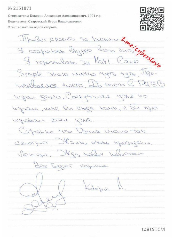 В сети опубликовали одно из писем Александра Кокорина, в котором он рассказал о пристрастиях в киберспорте, отношении к Месуту Озилу и трагедии с президентом "Лестера". Всего, по сообщению адвоката Кокорина, футболист ответил более чем на 1000 писем.