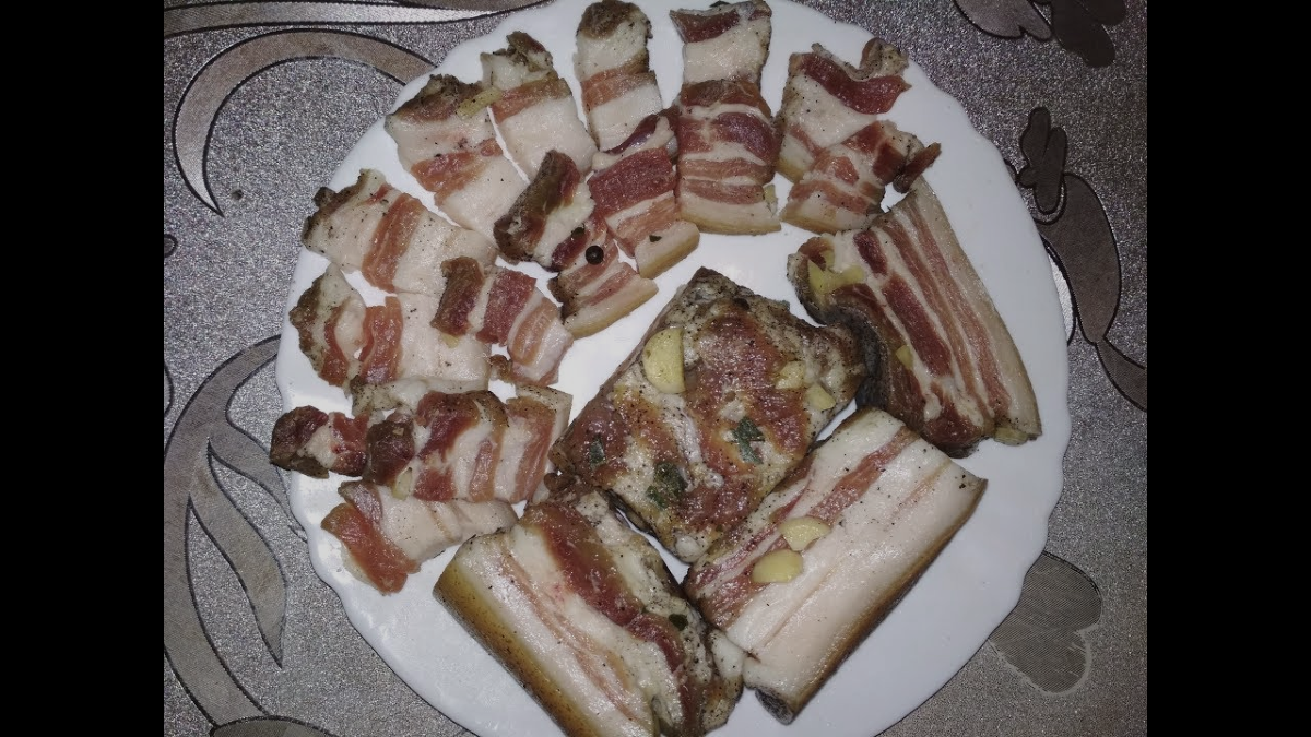 Хочу обратить Ваше внимание на соленое сало. Это очень обособленный продукт, с которым конечно очень много интересного связано. И говорить о его полезности или вредности считаю нет смысла, ибо его применение безгранично. Напишу один из рецептов приготовления солёного сала, может кто то и возьмёт себе на заметку. Начнём с того, что выбираю я всегда мясо на глаз и обязательно чтобы небыло прожилок, на ощупь мягкое, ну и конечно с прожилками мяса. И так, Берём примерно полкило сала, обязательно чесночёк зубчиков 7, тоже на глаз смотря по размеру, конечно же соль 500гр и приправы, я их беру у знакомого и не заморачиваюсь, говорю для посолки сала и всё, также можно конечно использовать и магазинные для мяса. 1. Чеснок чистим, моем, сушим, тонко режем поперёк 2. На тарелку сыпим соль, застилаем всё дно. 3. Промываем сало в холодной воде и обсушиваем полотенцем. 4. Делаем надрезы на сале, чтобы вложить туда кусочки чеснока. 5. Проделав эти процедуры кусок сала вместе с вставленным чесноком об