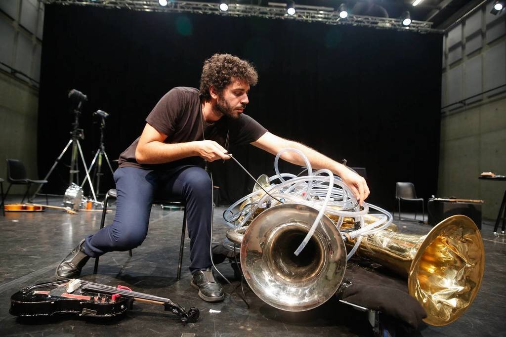 Как только попадаешь в зал, семь людей уже хаотично перемещаются по сцене. Они обозначены именно как люди, а не как исполнители, поскольку и исполнять им вроде нечего. Первые минут 20 кто-то отчаянно пытается закрепить пюпитр, который постоянно предательски падает, кто-то не может настроить нужный барабан, кто-то не знает куда деть свою бас-флейту. Все действие строится на том, что никак не может начаться.
