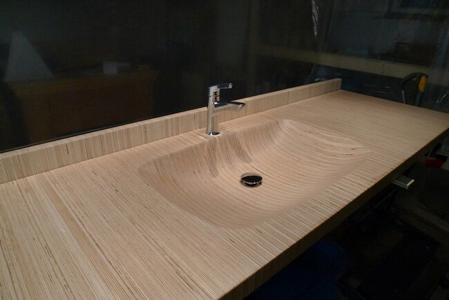 Фото основных этапов изготовления столешницы своими руками. На фото выпиливание основных элементов мойки столешницы. При их соединение, как раз, мойка и сформируется. Вы можете изначально задаться размерами той глубины столешницы, которая Вам необходима. Стягиваем проклееные элементы мойки столешницы шпильками. Здесь вместо шпилек можно использовать мощные струбцины. Сглаживаем внутреннюю глубину мойки до плавного перехода, убираем все ступеньки и тщательно шлифуем. Вырисовывается мойка будущей столешницы. Примеряем элемент слива. По аналогии наращиваем остальную часть массива столешницы до нужной длины. Вид сверху. Вид снизу. Далее приступаем к шлифовке. Затем наносим лакокрасочное покрытие. Когда лакокрасочное покрытие высохло, столешница практически готова. Изготавливаем бортик к столешнице и монтируем сантехнику. Вуаля! Наша классная столешница готова к монтажу и эксплуатации! Спасибо за внимание! Успехов!