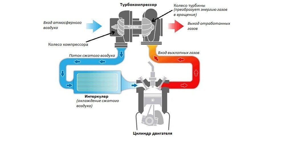 Альфред Бохи является изобретателем данной технологии, именно на его имя был выдан патент в 1911 году. Своими руками этот гениальный инженер создал и произвел установку первый работающий турбокомпрессор, и, хотя результаты его труда были ошеломляющими, однако массовое использование в автомобилестроении началось гораздо позже. Турбонаддув - устройство, предназначенное для увеличения мощности двигателя внутреннего сгорания (ДВС), благодаря использованию энергии отработанных газов. Далее мы всё подробно расскажем и покажем на схеме. Но прежде чем разбираться в тонкостях функционирования турбины, стоит ознакомиться с принципом работы самого ДВС. Существуют разные типы ДВС, в зависимости от количества цилиндров (автомобили могут иметь от 3-х до 12-ти). По сути каждый цилиндр выполняет один и тот же процесс, состоящий из следующих четырех тактов: Впрыск – поршень в цилиндре опускается вниз, в этот момент в камеру внутреннего сгорания поступает смесь воздуха и топлива (если двигатель бензи