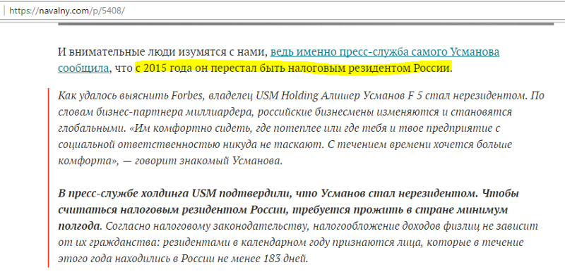 В своей статье «Второй день суда с Усмановым» Алексей Навальный утверждает, что Усманов «с 2015 года перестал быть налоговым резидентом России». А в ранее опубликованном видео-ролике Навальный и вовсе утверждает, что Усманов отказался от налогового резидентства России. Эти два утверждения Навального можно опровергнуть. В своей статье Навальный приводит копии двух справок из налоговой инспекции. В официальных документах утверждается, что Усманов в 2015 и 2016 г.г. являлся налоговым резидентом Российской Федерации. Обе справки датированы 18 маем 2017 года. Навальный также ссылается на статью в Forbes «Бизнесмен официально признал, что не находился в России больше полугода» от 17.10.2016 года. Он приводит цитату из статьи: «В пресс-службе холдинга USM подтвердили, что Усманов стал нерезидентом. Чтобы считаться налоговым резидентом России, требуется прожить в стране минимум полгода». Мы же обратимся и к другим источникам информации. «Интерфакс» дополнил информацию Forbes в тот же день (17