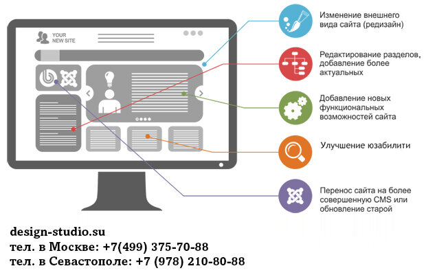 -существенное увеличение информации, которую заказчик хочет представить на сайте (дополнительные товары, рубрики, статьи, изображения, видео). Все эти нюансы решает редизайн сайта! Модернизация и обновление - вот что такое "Редизайн" и вот, что вам нужно!