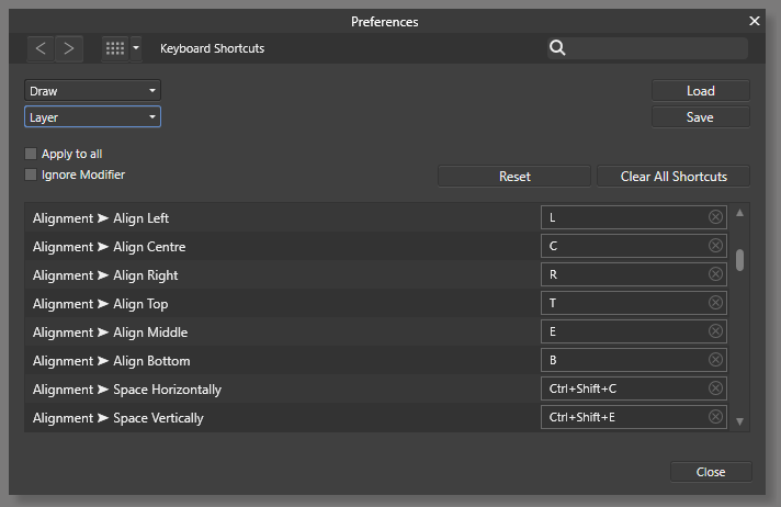Например, я совершенно не представляю, как возможно обходиться без горячих клавиш на такие часто используемые действия, как выравнивание объектов. Поэтому, первым делом я переназначаю именно их.