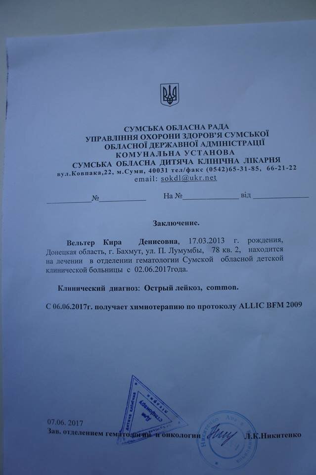 Кирочка почти год ходит в садик (с 3-ех лет), в марте ей исполнилось 4 годика. Начала часто болеть простудой, все ссылались на адаптацию. В начале весны Кира заболела бронхитом, мы вылечились, и решили 2 месяца не ходить в сад, чтобы организм отдохнул от лекарств и восстановился. Кирюша начала жаловаться, что у нее болят ножки, так же появилась мелкая сыпь, красноватая моча и синяки. Мы поехали в больницу, нас положили, сделали все необходимое, но по анализам, с подозрением на лейкоз, сказали ехать в Харьков или Донецк. В Харькове нас не приняли, нет мест. Чтобы ехать в Донецк. нужно делать пропуска, на это нужно время. И нам предложили поехать в Сумы, мы конечно же согласились, так как терять время нельзя. Нас привезла скорая в Сумскую больницу, чуть больше недели назад, и мы уже проходим здесь лечение с диагнозом острый лейкоз. 4 дня Кира пила таблетки, теперь такой же препарат будут еще капать, так же под капельницей Кира находилась с пятницы по четверг. Ей конечно не нравятся