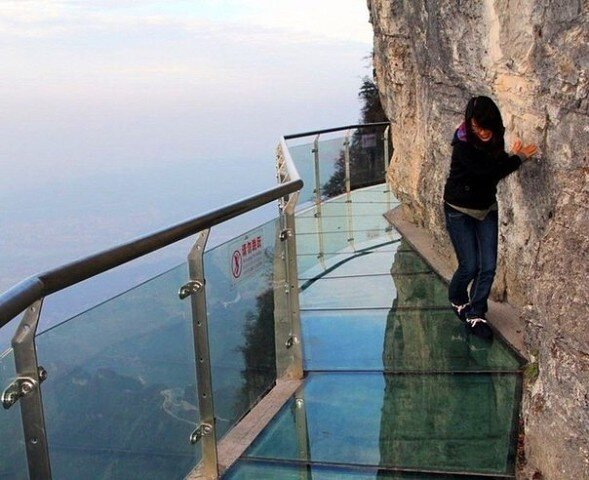 Вам сильно не хватает адреналина? Отправляйтесь на гору Тяньмэнь, а любезные китайцы предложат вам совершить прогулку по стеклянной тропе ведущей на вершину этой горы. Длина тропы не более 70-ти метров, но она уже давно среди туристов получила название «тропа ужаса». Бездонная пропасть под ногами и только 6 сантиметров стекла между вами, не это ли настоящее испытание? Храбрецы, утверждающие, что без особого труда пройдут по этой тропе быстро усмиряют свое бесстрашие, подходя к самому началу "испытания". Чтобы у человека складывалось впечатление "ходьбы по воздуху", китайцы постоянно очищают стекла от грязи и даже пыли, поддерживая тем самым, идеальную прозрачность тропы. С тропы, открывается поразительный вид на каменные столбы, входящие в Национальный парк и ставшие прототипом для летающих островов в фильме "Аватар". Стеклянная тропа считается самым страшным аттракционом в мире.