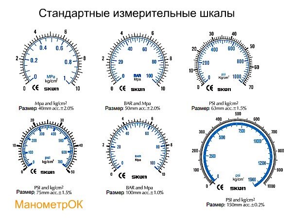 Манометры. Стандартные измерительные шкалы Виброустойчивые манометры – это механические приборы для измерения давления в системах подачи неагрессивных газообразных и жидких сред. Особенность конструкции этих приборов заключается в заполнении внутренней полости жидкостью для повышения устойчивости к воздействию вибрации и пульсации. Благодаря этому такие манометры применяются на промышленных предприятиях, в энергетических комплексах, а также системах бытового снабжения. Диапазон измерения – один из самых важных параметров прибора. Стандартный ряд давлений для манометров: 0-1, 0-1.6, 0-2.5, 0-4, 0-6, 0-10, 0-16, 0-25, 0-40, 0-60, 0-100, 0-160, 0-250, 0-400, 0-600, 0-1000 кгс/см2=бар=атм=0.1Мпа=100кПа Кроме того, при выборе манометра необходимо обращать внимания на такие параметры как диаметр и класс точности. Диаметр манометра — это важный параметр для манометров в круглом корпусе. Стандартный ряд диаметров для манометров: 40, 50, 63, 80, 100, 150, 160, 250 мм. Класс точности — это доп