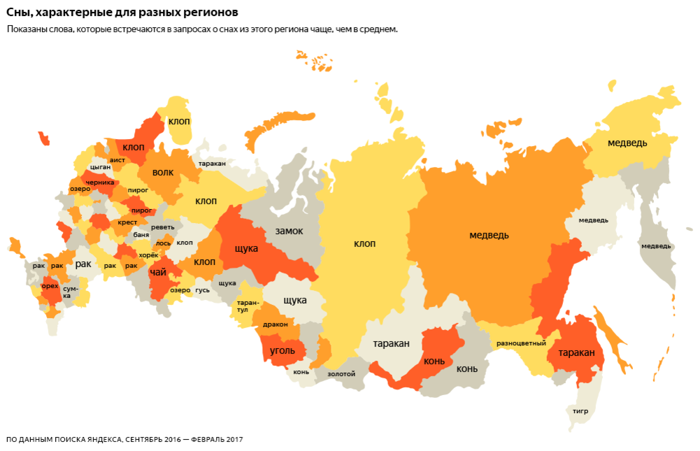 Каждую неделю пользователи Яндекса задают более полумиллиона запросов о толковании снов. Аналитики Яндекса проанализировали все запросы со словами «к чему снится» и выяснили, какие сны люди видят чаще всего и как на сны влияет место жительства. Самые популярные сны практически одинаковы на всей территории России. Чаще всего в описаниях снов встречаются люди: взрослые и дети, мужчины и женщины, близкие и незнакомые, в некоторых случаях — мёртвые. Самые распространённые животные — рыбы и змеи: им посвящены примерно по 2% запросов о снах. Среди остальных животных чаще всего снятся собаки, кошки и крысы. Наиболее популярный цвет в сновидениях — белый, действие — умирать, а часть тела — рука. 10 самых популярных слов из запросов про сны 1. Человек. 2. Рыба. 3. Ребёнок. 4. Змея. 5. Умирать. 6. Живой. 7. Парень. 8. Беременность. 9. Вода. 10. Зуб. Женщинам и мужчинам снятся разные сны В женских снах чаще всего встречаются человек, ребёнок, беременность, рыба и парень, а в мужских — змея, рыба,
