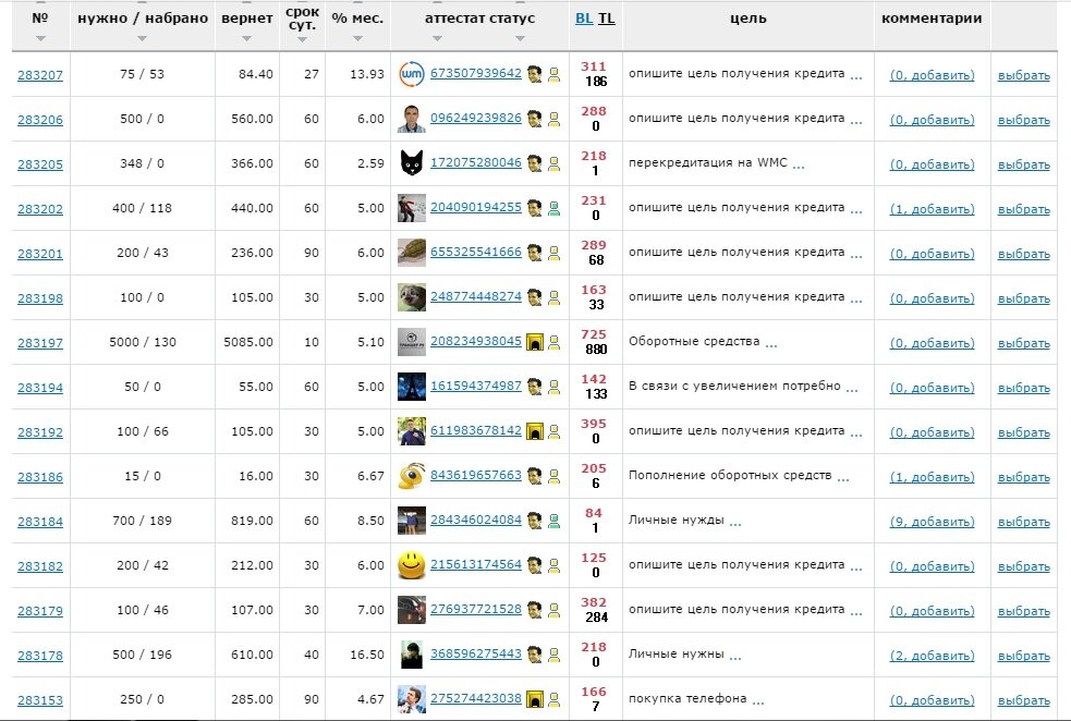 Не каждый пользователь WebMoney знает, что можно заработать на выдачи WMZ под проценты через биржу кредитов. Биржа открыта для всех участников WebMoney, у которых есть начальный аттестат и хочет взять или выдать кредит. Заходя на биржу, Вы увидите заявки, оставленные теми, кто хочет получить кредит. В каждой заявке указано сколько нужно всего WMZ, сколько уже выдано, на какой срок, под какой процент, на какие цели и т.д. Вам нужно лишь выбрать того, кому Вы хотите выдать займ. Понятно, что не каждому можно доверять. Поэтому приведу несколько рекомендаций, чтобы инвестировать в плюс (из моего опыта): 1. Не выдавайте кредит под слишком большой процент. Выбирайте в диапазоне 3-9% в месяц. Также помните о том, что WebMoney берет комиссию 0,8% 2. Проверьте сколько заемщик уже взял кредитов и сколько вернул. Не выдавайте кредит, если он не вернул больше 10% от взятой общей суммы. Например, на картинке в верху видно, что заемщик взял кредитов на сумму 433 167,41 WMZ и вернул 422 582,41 WMZ.