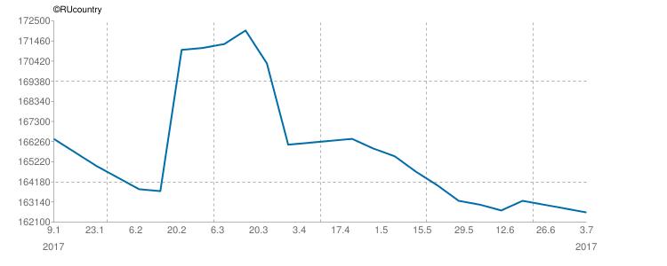 За минувший период изменение средней цены предложения на вторичном рынке квартир в рублевом эквиваленте составило минус 0,12%, это 200,0 руб. с кв. м. Показатель средней цены предложения за неделю с 26 июня 2017 г. по 3 июля 2017 г. составил 162,6 тыс. руб. за кв. м. Вторичный рынок однокомнатных квартир За минувший период изменений средней цены предложения на вторичном рынке квартир не произошло. Показатель средней цены предложения за неделю с 26 июня 2017 г. по 3 июля 2017 г., как и за предыдущую неделю составил 170,2 тыс. руб. за кв. м. Вторичный рынок двухкомнатных квартир За минувший период изменение средней цены предложения на вторичном рынке квартир в рублевом эквиваленте составило минус 0,12%, это 200,0 руб. с кв. м. Показатель средней цены предложения за неделю с 26 июня 2017 г. по 3 июля 2017 г. составил 161,6 тыс. руб. за кв. м. Вторичный рынок трёхкомнатных квартир За минувший период изменение средней цены предложения на вторичном рынке квартир в рублевом эквиваленте