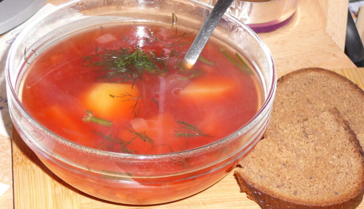 Приготовленное блюдо таким способом, получается наваристым, сытным и необычайно вкусным. К тому же благодаря, составляющим супа, блюдо получается еще и полезным. Свекольный суп идеален тем, что в нем собраны все нужные витамины для зимы, такие как: C, PP, B. А также, благодаря свекле в супе улучшается пищеварение, и выводятся вредные яды. Суп из свеклы рекомендуется кушать со сметаной, так как она помогает нейтрализовать щавельную кислоту. Свекла помогает наладить обменные процессы организма, оздоровляет печень, нормализует давление, освобождает организм от застоявшихся бактерий. Свекла это овощ и источник витаминов, который постоянно должен присутствовать на вашем столе. Такой суп, рекомендован людям с высоким коэфициентом веса и с болезнями печени. Суп со свеклой содержит 40 калорий на сто грамм. Время приготовления: час Сложность готовки: просто Ингредиенты: Говяжья консерва; Филе одна штука; Пять картофелин; Перловка сто грамм; Бульонные кубики две штуки; Пять маленьких штук с