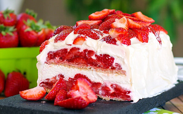Украсьте получившийся торт остатками взбитых сливок и клубникой.