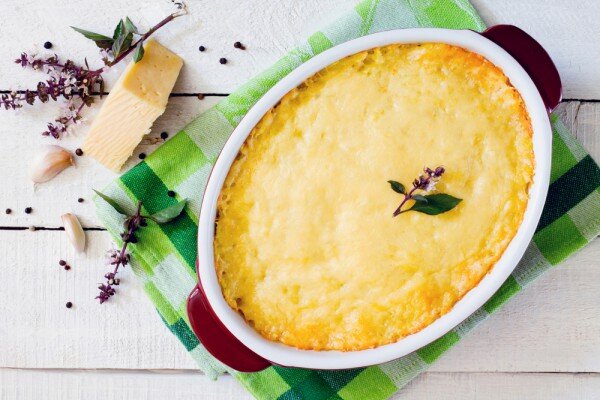 Рецепт вкусного и сытного обеда: готовим запеканку из картофельного пюре с мясным фаршем, шампиньонами и сыром. Ингредиенты: картофель — 1 кг соль, перец — по вкусу молоко — 1/2 стакана сливочное масло — 50 г твердый сыр — 100-150 г растительное масло — для обжаривания репчатый лук — 1 шт. чеснок — 2 зубчика грибы — 200 г смешанный фарш — 500 г Приготовление: Картофель почистить, нарезать пластинками и сложить в кастрюлю. Залить водой, посолить и довести до кипения. Варить около 25 минут, пока картофель не станет мягким. Добавить масло, молоко и растолочь картофель в пюре. Добавить половину тертого сыра. Обжарить измельченный лук и чеснок до мягкости, добавить нарезанные кубиками грибы. Жарить до готовности, посолить и поперчить. Переложить все на тарелку. Добавить в сковороду смешанный фарш и жарить, все время разбивая комочки, пока мясо не подрумянится. Приправить, перемешать с грибами и луком. Выложить на дно формы половину картофеля, затем начинку. Покрыть оставшимся картофельн
