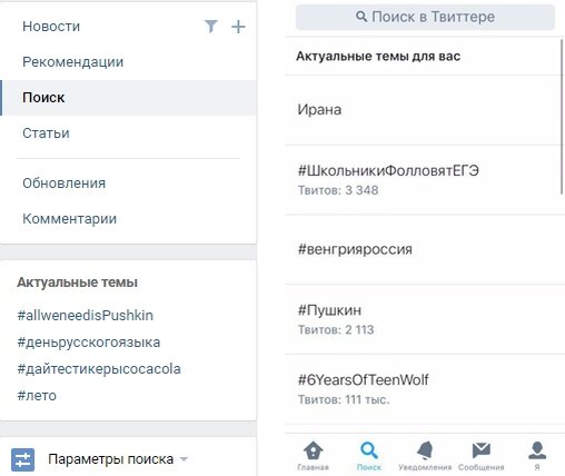 В Twitter указаны актуальные темы на сегодняшний день. «Вконтакте» актуальные хештеги можно найти, зайдя в раздел новости и выбрав вкладку «Поиск». На странице отобразятся популярные темы.