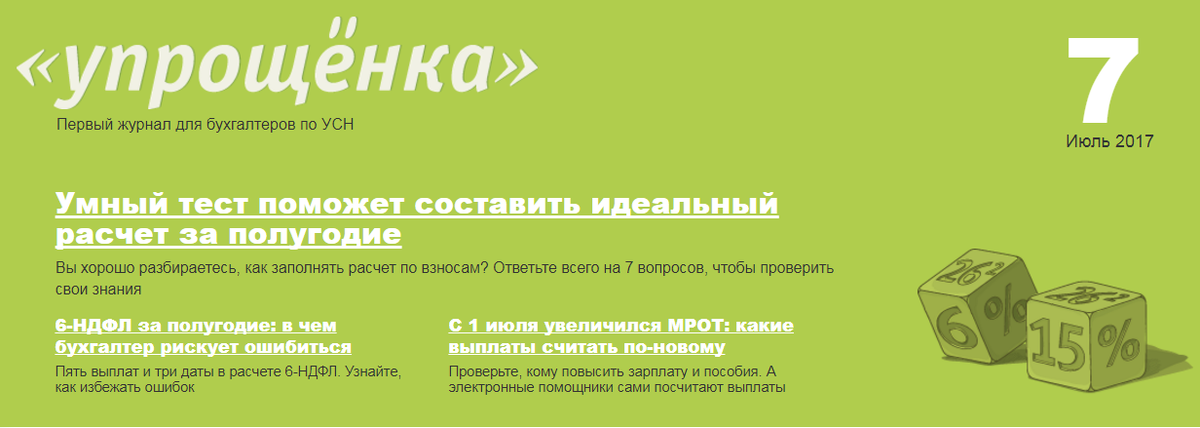 Журнал «Упрощенка» отрыл для бухгалтеров пробный доступ к статьям на три дня. Подтвердите — и прочитайте статьи про изменения в работе! С 1 сентября налоговики без суда закроют фирмы с массовыми адресами Кассовые документы отменены с 01.07.2017 В 72 регионах РФ снижены ставки по УСН В июле изменился расчет зарплаты Подтвердить доступ