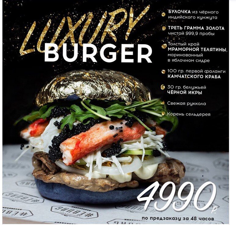 Пока вы уплетаете Бик Мак в соседней Макдачке, настоящие пацаны заказывают себе Это – бургер за 5000 рублей. Что можно сделать такого из булки с мясом, чтобы она стоила настолько сумасшедшие деньги? Спросите в Краснодаре, там нашлись мастера по приготовлению в прямом и переносном смысле золотого бутербродика. В суперпупер бургере поместились: кусок мраморной говядины, черная икра, кусок крабовой мякоти, а еще руккола и сверху лист фольги из золота – чего мелочиться. Бургер, конечно, впечатляет, а заказывать его надо за 48 часов. Так что просто, проезжая мимо Краснодара – отведать изысков не получится. Но вообще, конечно, идея намешать говядину с черной икрой и крабами это сильно. Что называется – богато! Хотя по делу – лучше бутер с игрой отдельно, бургер с мясом – тоже. Но зато, когда вам принесут такое произведение – понты будут немерянными. Ресторан, где делают это чудо, специально не упоминаю, чтобы не подумали, что реклама. Впрочем, может я не такой уж знаток современной бургерно