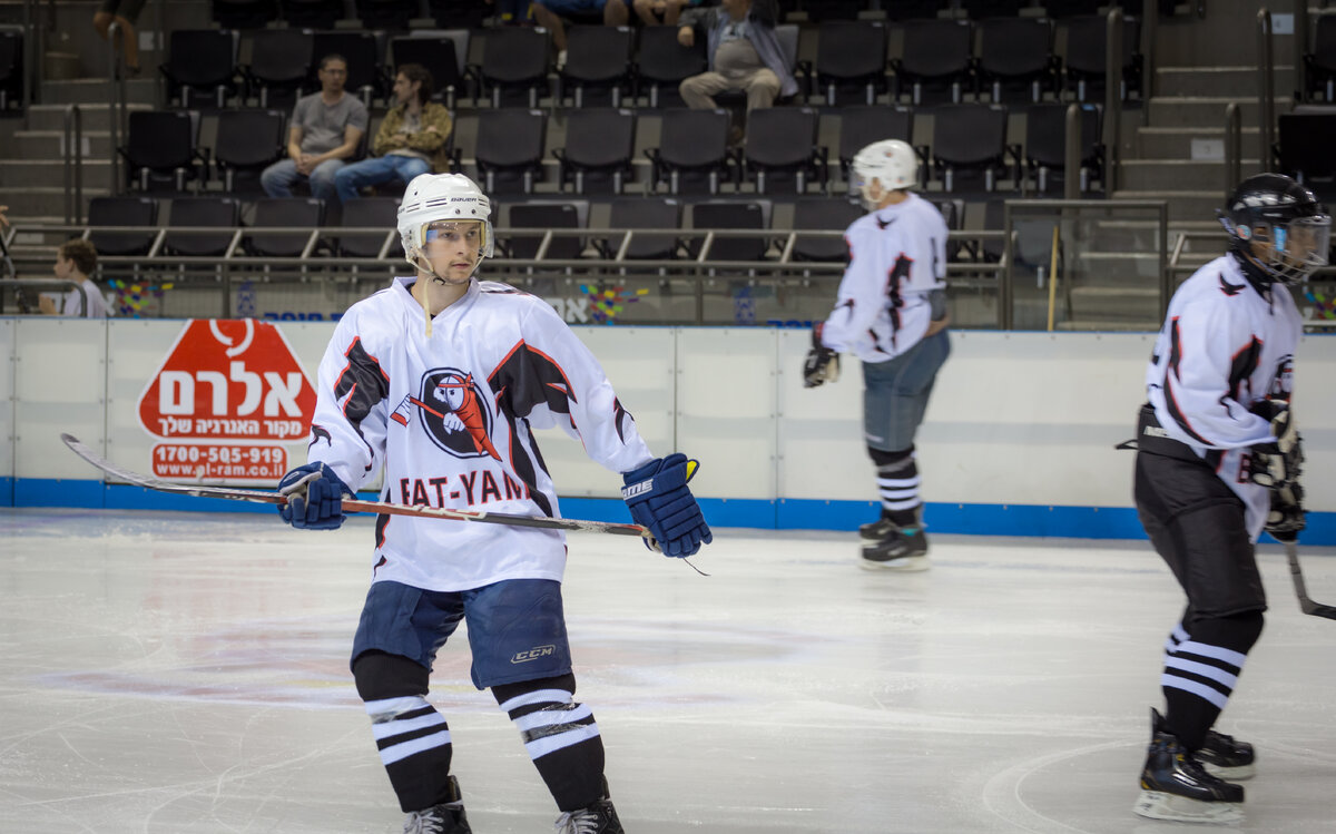 Вы не поверите, но в нашей жаркой стране есть хоккейная лига, сборная Израиля даже умудряется участвовать в каких то турнирах, но как вы понимаете по ТВ мы еще не скоро увидим. Вряд ли когда-либо Евроспорт выкупит права на трансляцию хоккейного матча Израиль - Мексика :) А в летние месяцы, в Хайфе, вместо баскетбольной арены разбивают каток, чтоб не свихнуться от изнуряющей жары и просто получить кайф от катания на коньках. Ну а за одно начали проводить хоккейный турнир, чтоб народ развлечь и чтоб команды не скучали в межсезонье. Вот на один из матчей такого турнира мы и сходили, благо вход на такие мероприятия у нас бесплатный. Что вам сказать, те кто имел счасть побывать в пионерских лагерях в советскую бытность наверное помнят такую игру как пионербол, вроде и площадка волейбольная и мяч такой же, но это точно не волейбол. Вот и у меня были такие же впечатления от матча, вроде как и все в хоккейной амуниции, и на льду, но это точно был не хоккей. Вы себе можете представить хокке