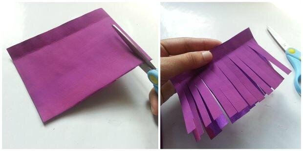 1. Возьмите лист бумаги, сложите его пополам и нарежьте тонкие полоски 2. Скрутите каждую полоску до изгиба 3. Далее возьмите бумагу зеленого цвета, нанесите на поверхность клей и начиная с угла скрутите в трубочку 4. Затем склейте стебель с цветком 5. Получаем красивый цветок 6. Берем новый зеленый лист и складываем его гармошкой 7. Затем поправляем концы ножницами 8. Приклеиваем травку к стебельку 9. Получаем красивый букет