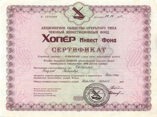 В 1992 году городе-герое Волгограде появилась фирма "Хопёр-Инвест". Контору возглавил Лев Константинов. "Хопёр-Инвест" представлял собой классическую финансовую пирамиду. Компания начала печатать сертификаты, которые создатели пирамиды называли "акциями". Лицензии ФКЦБ (Федеральная комиссия по рынку ценных бумаг) "Хопёр" не имел, поэтому он не мог эмитировать ценные бумаги легально. Каждый покупатель "акции" становился на время "соучредителем" компании. После погашения сертификата вкладчик выводился из состава "учредителей". Такая схема позволяла использовать несовершенство законов того времени. Доходность сертификатов составляла "стандартные" 30 процентов в месяц.