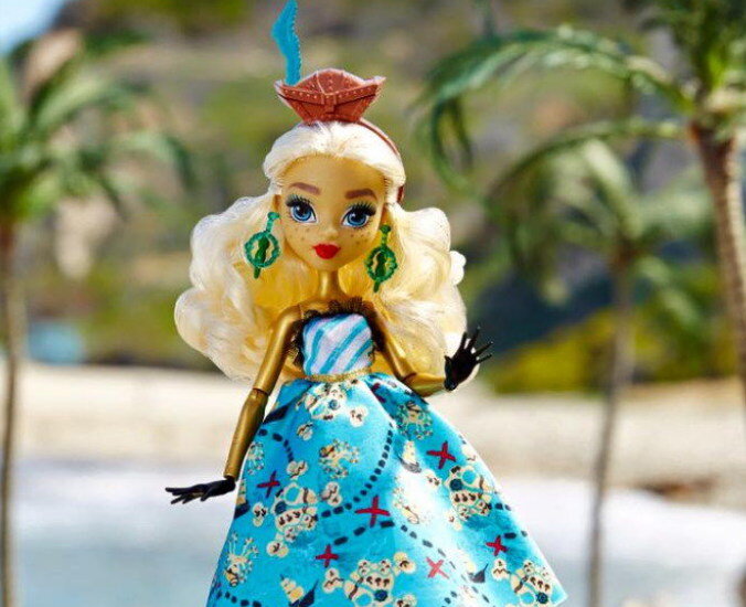 Дана Трежура Джонс, героиня линии Monster High - дочь Дэйви Джонса, капитана Летучего Голландца и хозяина чудовищного морского создания Кракена! Образ Дэйви Джонса основан на одном из персонажей богатого морского фольклора 18-го и 19-го веков; в этих мифах Джонс представлен своеобразным морским дьяволом. Также в этой серии - куклы Дракулаура, Клодин Вульф, Лагуна Блю, Рошель Гойл, и другие. Живая мифология - к вашим услугам. Дана - в буквальном смысле слова золотая кукла. Её руки и ноги золотые, к тому же украшены рельефно. Головной убор Даны - сундук с сокровищами! Но это ещё не всё! Сокровища у неё можно найти буквально под каблуком, её туфли устроены очень хитро! Дана умеет прятать золото... А её серьги изображают висячее кольцо с сидящим на нём попугайчиком. Настоящая пиратка!