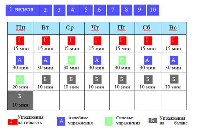 Желаете оставаться в хорошей физической форме на протяжении всей жизни? Наиболее разумным способом достижения подобной цели будет чередование физических нагрузок разной интенсивности. Составьте себе план упражнений для развития спортивной формы подобный приведенному ниже, который позволит вам оставаться стройным на протяжении всей жизни. Десятинедельный план (представленный в таблице) включает в себя чередование четырех основных видов упражнений: аэробную нагрузку (А), силовую тренировку (С), упражнения на гибкость (Г) и упражнения на сохранение баланса (Б). Они оказывают положительное влияние на весь организм. Каждый из видов упражнений более детально описан ниже. Предлагаемый 10-недельный комплекс оптимально сочетает все составляющие и подходит практически для каждого из нас. Аэробные упражнения позволяют снизить риск возникновения различных заболеваний, а также способствуют долголетию. Силовая тренировка – направлена на укрепление мышц и наращивание мышечной массы. Упражнения на