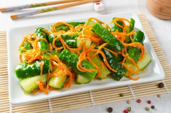 Ингредиенты: морковь — 1 шт. огурцы — 3-4 шт. рисовый уксус — 2 ст.л. тертый корень имбиря — 1 ст.л. кунжут — 1 ст.л. Приготовление: Морковь почистить и натереть на корейской терке. Огурцы нарезать брусочками. Корень имбиря почистить и натереть на мелкой терке. Выложить огурцы и морковь на тарелку. Смешать рисовый уксус, имбирь и кунжут, полить салат. Приятного аппетита! Больше рецептов на нашем сайте - https://recase.org
