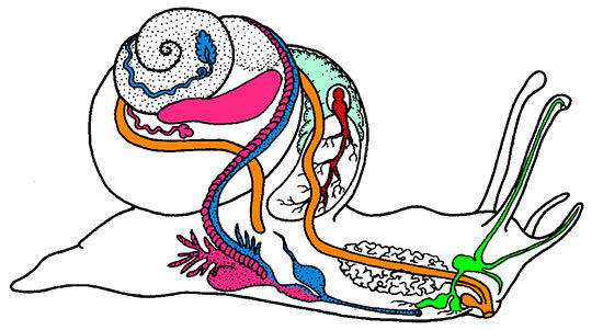 Внутренностный мешок представляет собой объемное выпячивание на спинной стороне, внутри которого расположен целый ряд органов. Непосредственно под раковиной расположена мантия, одетая на внутренностный мешок. Ее передний край, свободно свисающий над туловищем, прикрывает мантийную полость. Для большинства брюхоногих характерно отсутствие двусторонней симметрии, обусловленное наличием турбоспиральной формой раковины, поэтому наблюдается асимметрия органов мантийной полости и внутренностного мешка (одно предсердие, одна почка, одна жабра).